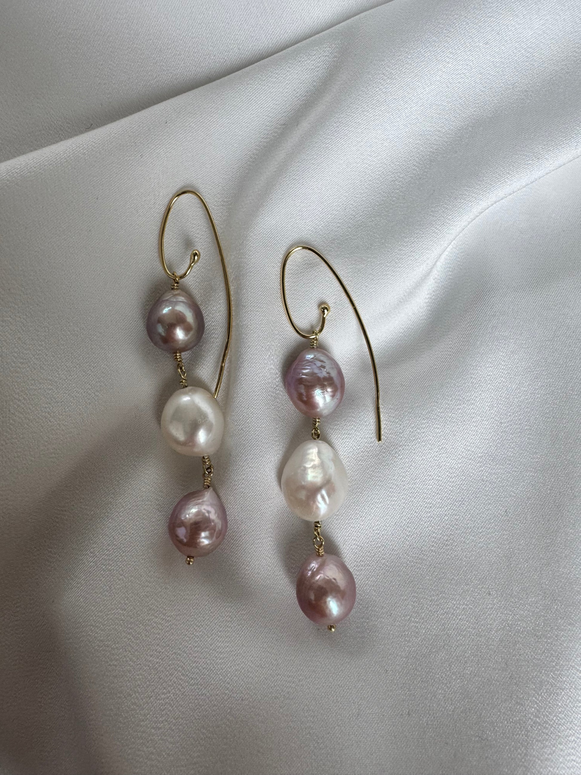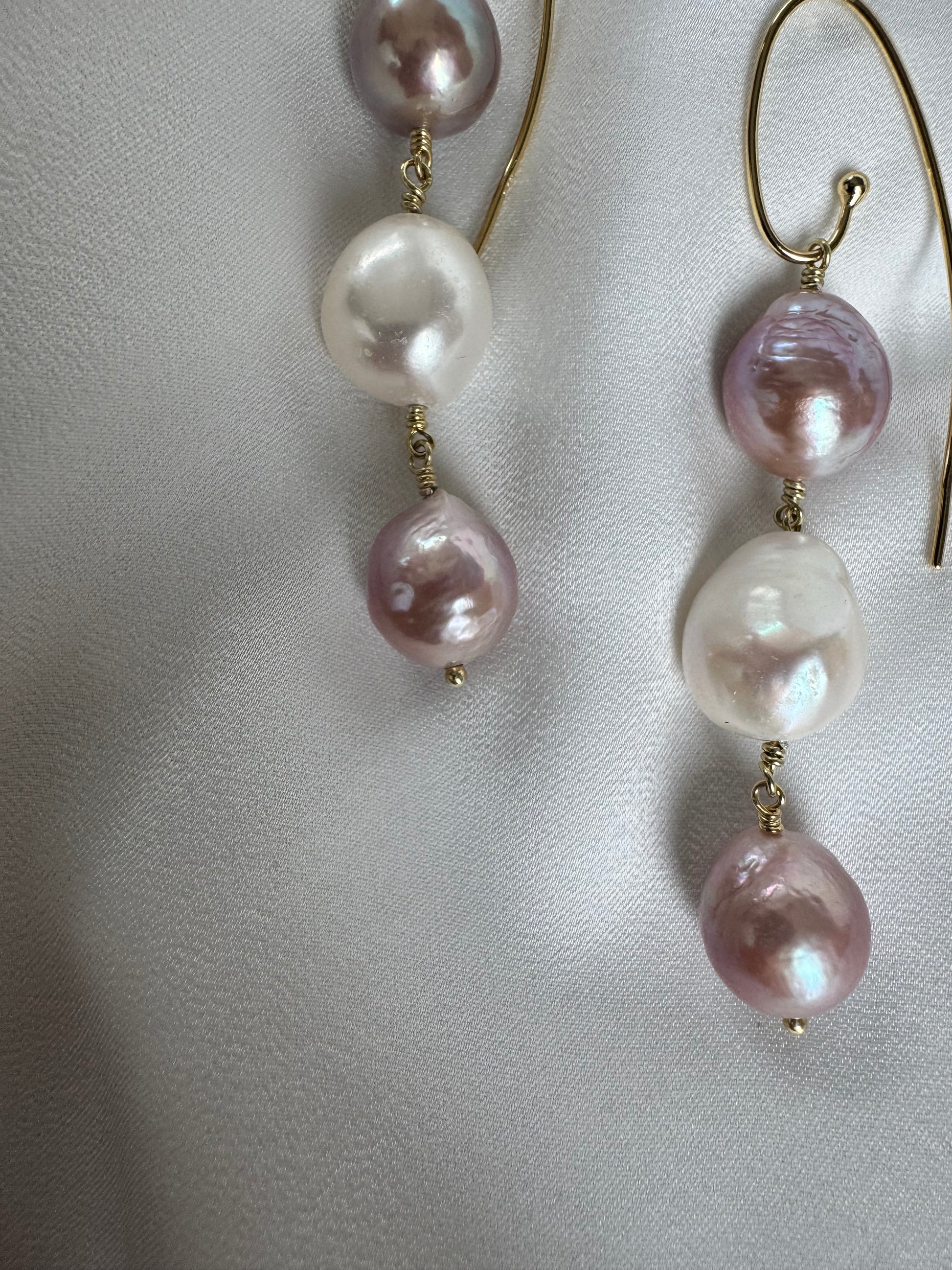 Unique Flow øreringe i forgyldt 925 sterlingsølv med barokke ferskvandsperler i rosa og hvid. Tre perler i et organisk fald. Blød bevægelse. Naturlig glød.